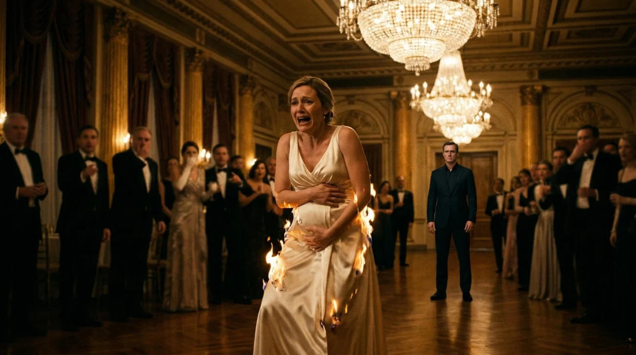 Claire staggered backward, both arms wrapped across her belly, her mind screaming protect the baby, protect the baby, while the heat climbed toward her ribs. A waiter tackled her with a tablecloth. Another appeared with a fire extinguisher, and the white blast of foam smothered the flames with a sound like a punch.