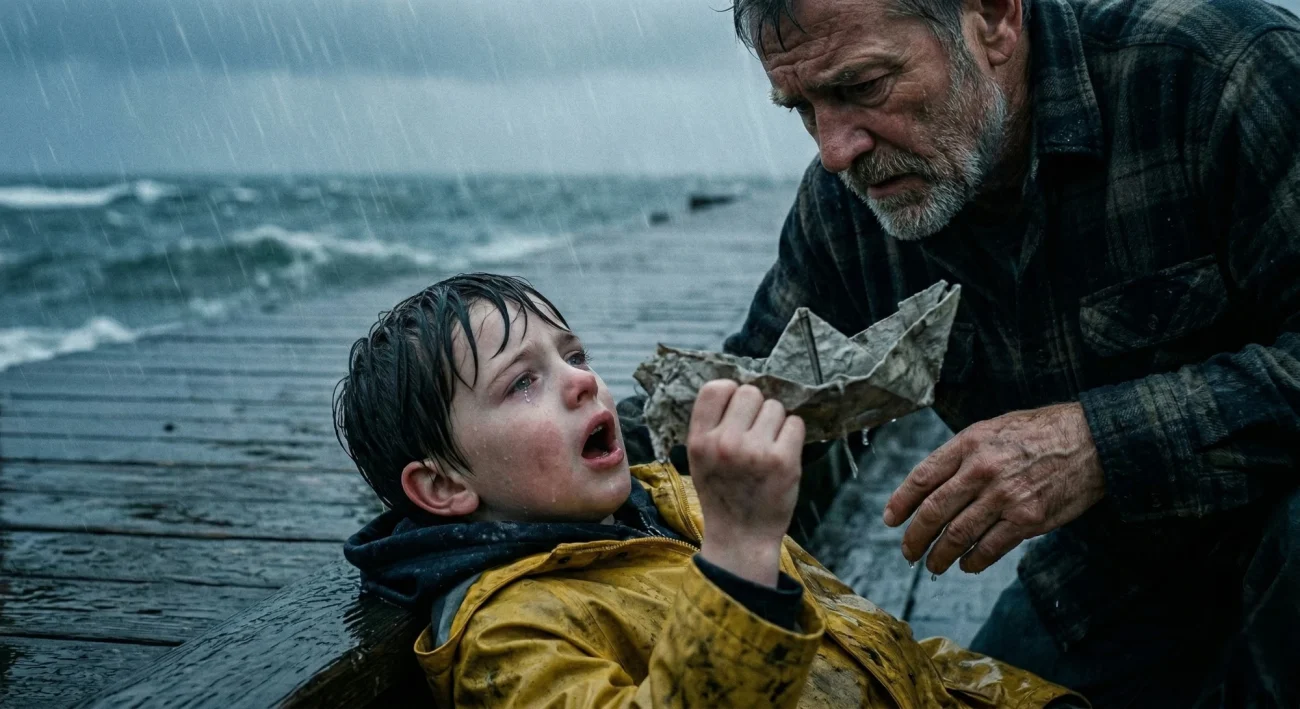 The wood planks shone with rain, and the waves hammered the pilings in deep, rhythmic thuds. Mitch walked out toward the end — he needed distance from the shore so the boat wouldn’t wash back. He crouched down to set it on the surface gently.