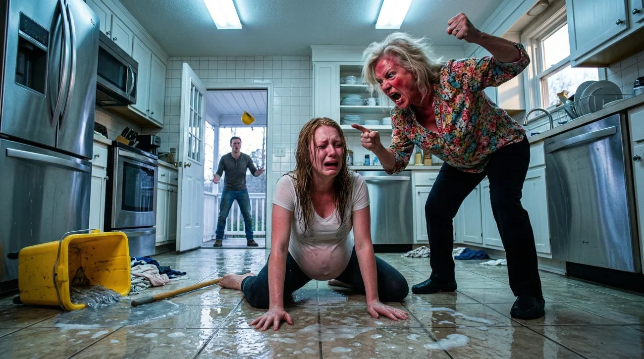 He took in the scene: me on the floor, soaked, one hand on my stomach, the other braced against the tile. Diane standing over me, arms crossed.