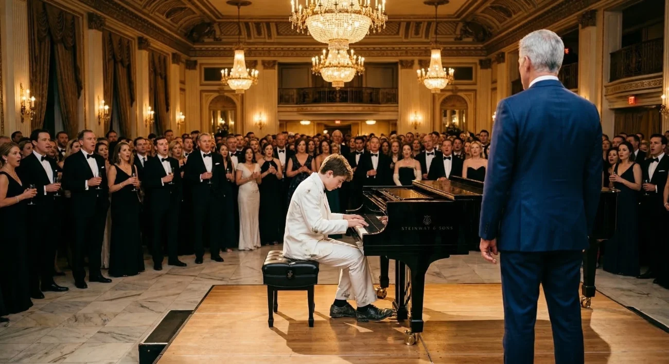 He didn’t plan it. He didn’t rehearse it. He just looked at the piano, and then he looked at the man standing closest to it — a tall man in a navy suit, laughing at something a woman in diamonds had said — and he heard his mother’s voice somewhere in his chest, low and certain: